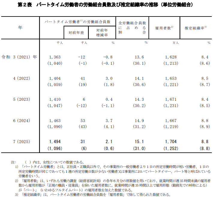 令和7(2025)年6月30 日現在のパートタイム労働者の労働組合員数(単位労働組合)は149 万4千人となっており、前年に比べて 3 万 1 千人(2.1%)の増加、全労働組合員数に占める割合は 15.1%で、前年より 0.2 ポイントの上昇となっています。