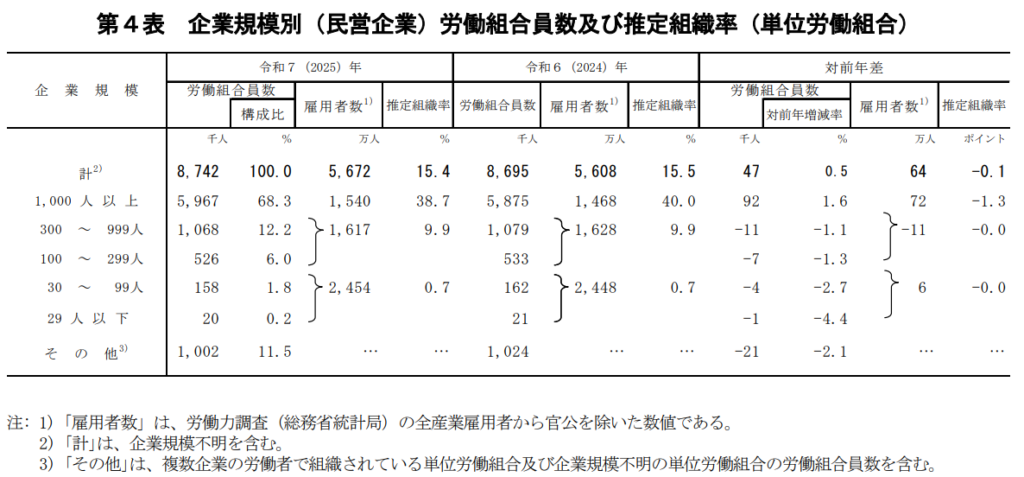 - 労働組合員数の数値は千人未満の単位を四捨五入しているが、対前年差(比)、構成比及び推定組織率は人単位の労働組合員数を用いて算出されています。