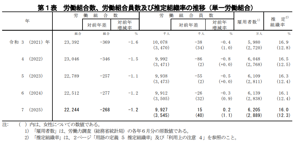 令和7(2025)年6月 30 日現在における単一労働組合の労働組合数は22,244 組合、労働組合員数は992 万 7 千人で、前年に比べて労働組合数は 268 組合(1.2%)の減少、労働組合員数は 1 万 5 千人(0.2%)の増加となっています。